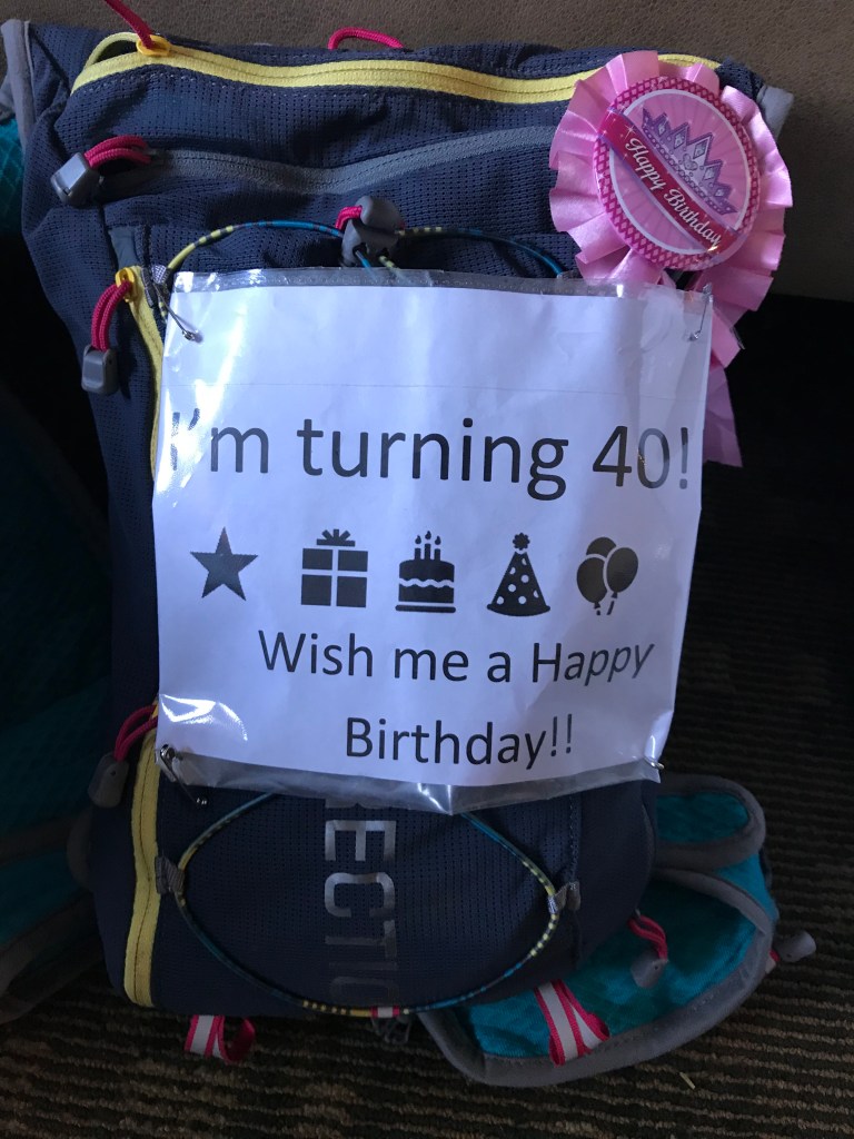 As I ran down the train tracks, I saw Keith Heslinga, who whooped, then as I passed him started laughing and shouted “Happy Birthday!” Janelle had decorated the pack I had just donned and was planning to wear for the remainder of the race, effectively creating for me a trail birthday party: