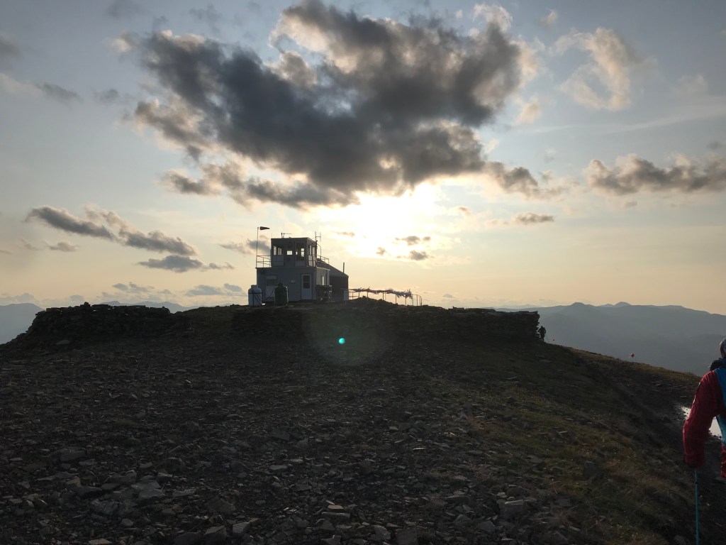 Another highlight of this leg was arriving at the aid station on the way up to the summit of Grande. I was thinking as I thought I was getting close “I hope they have chips, I could really go for some chips!” When I arrived there was literally a SMORGASBORD of chips. I think there were 6 different kinds, in costco-sized bags, wide open on a table like a chip buffet. I was ecstatic and sampled some of everything. I raved about this to the volunteers and anyone around me that would listen (ok, they didn’t have a choice did they?), joking with the guy beside me “why are ketchup chips even good? They’re SO GOOD!!” The volunteer chuckled and said “they never taste as good anywhere else as they do up here!” I took two fistfuls of my favourite flavours (plain and ketchup) to go and crushed them into my mouth as I walked. I also was remembering this part of the course from two years ago and appreciating that it was a bit cooler, but also observing what were clearly gathering dark clouds. As I rounded the curve up to the summit the first of the clouds arrived and we were very briefly pelted with sideways rain (jacket goes on), which ended just as quickly as it had come. I could tell from the sky that this was unlikely to be the end of the weather, but appreciated that the sun came back out for the time being.